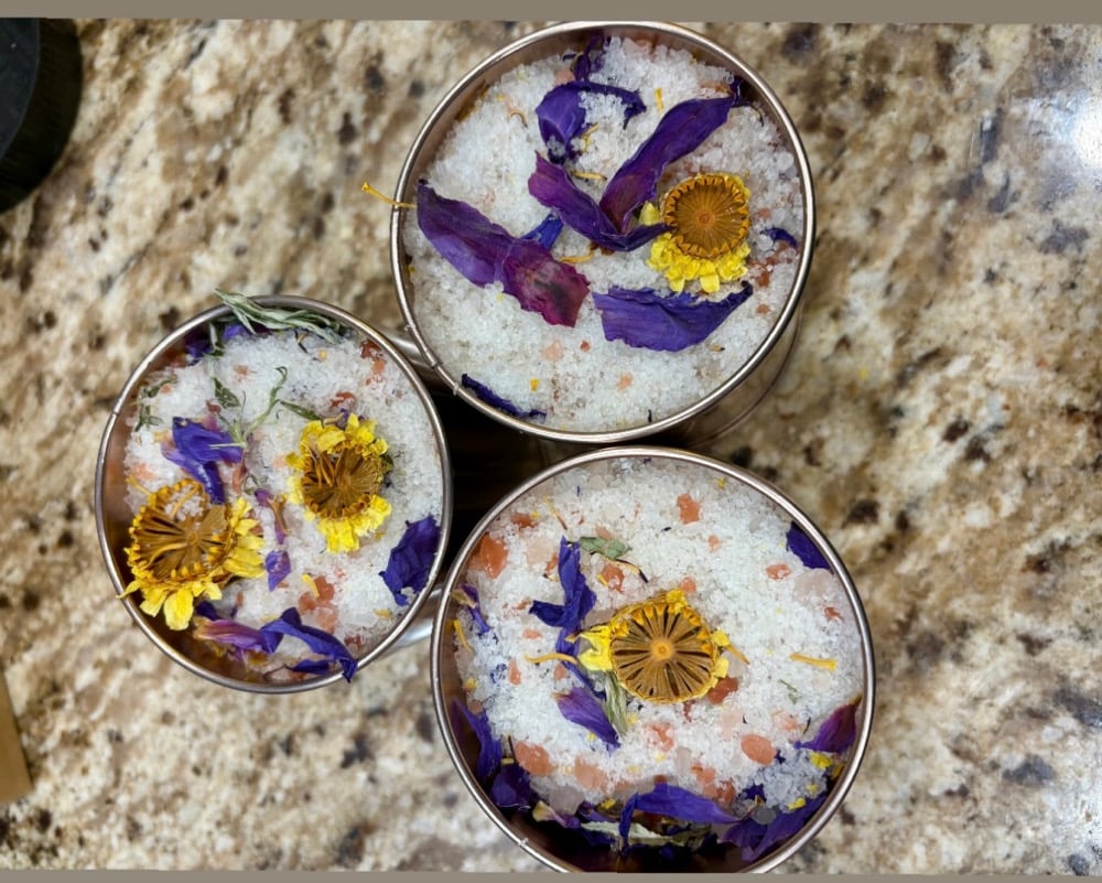 Organic ingredients: Epsom salt, pink salt, dead sea salt, baking soda, citric acid, essential oils, herbs